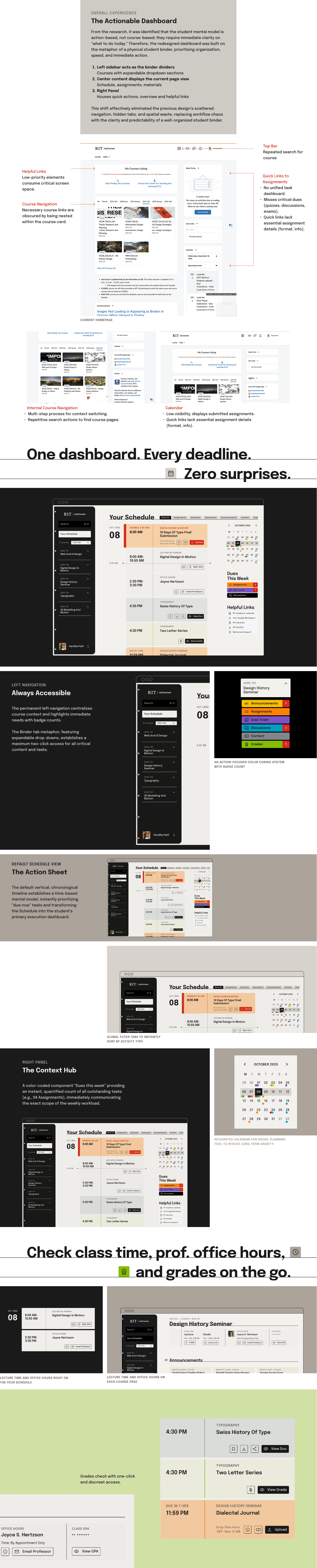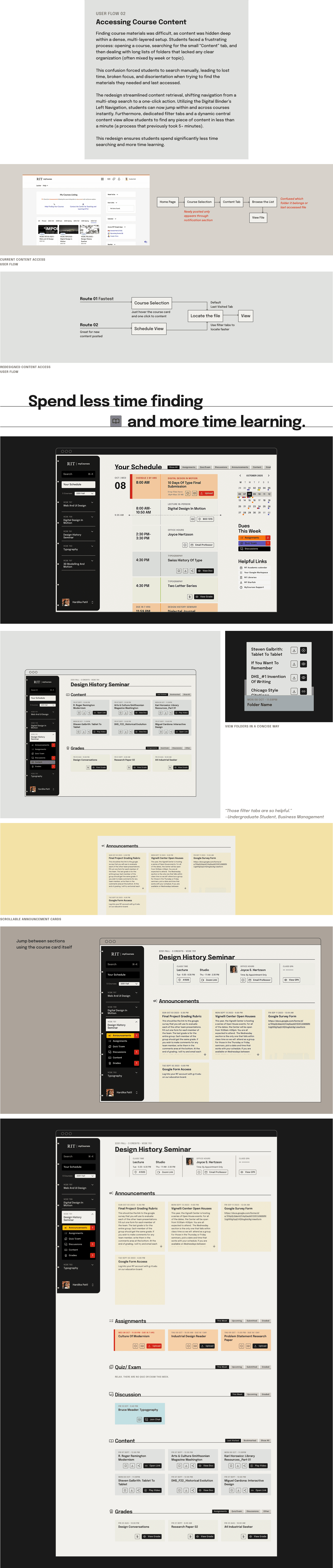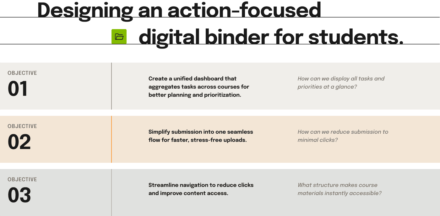 The final design transforms MyCourses into an intuitive “Digital Binder,” using structured navigation, semantic color-coding, and action-based components to reduce friction, simplify submission, and create a stable, organized academic environment.