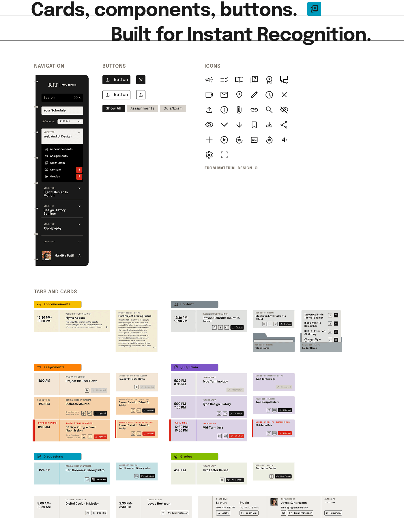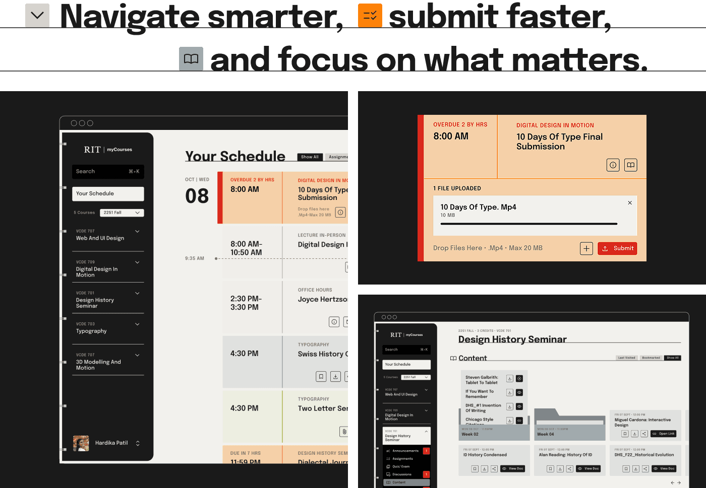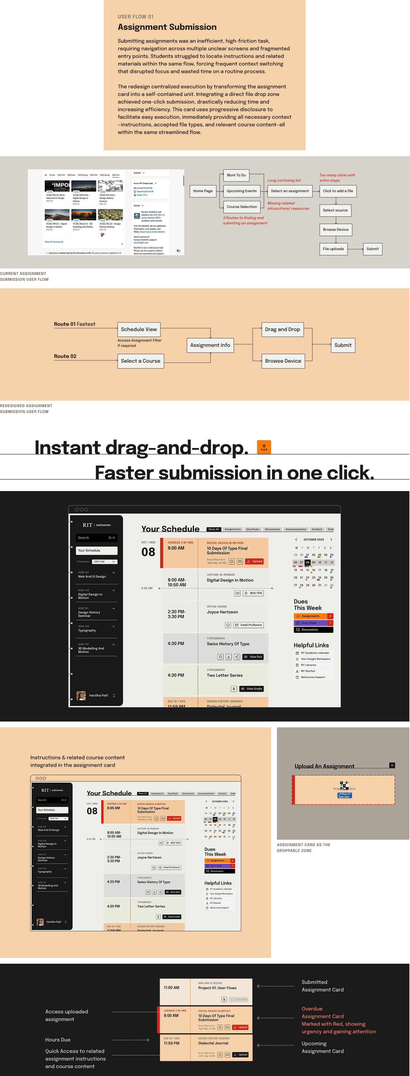 The final design transforms MyCourses into an intuitive “Digital Binder,” using structured navigation, semantic color-coding, and action-based components to reduce friction, simplify submission, and create a stable, organized academic environment.